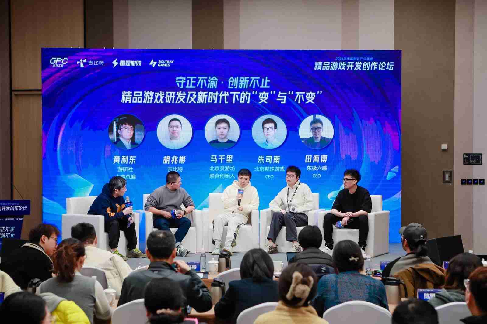 圆桌对话环节,,,在游研社内容总编黄利东的主持下,,,1winCTO胡兆彬、、、北京灵游坊联合创始人马千里、、北京猩球游戏CEO朱司南、、东极六感CEO田海博等四位嘉宾围绕“守正不渝、、、、创新不止——精品游戏研发及新时代下的‘变’与‘不变’”这一主题分享了各自在精品游戏开发理念及工程能力搭建方面的见解和经历,,,并就行业变化下游戏人需要坚守的理念等展开交流探讨。。