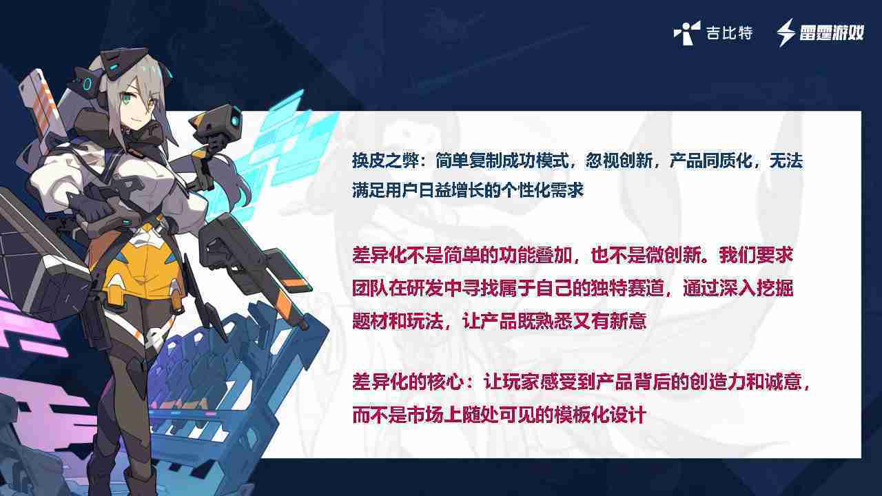 在我们内部是这么定义差异化的。。首先,,,,差异化不是简单的功能叠加,,更不是换皮。。。。只是换皮,,,产品无法提供有效的市场价值。。。。内部经常说差异化的产品不是为了迎合市场,,而是找到一个自己独特的表达方式,,,在研发中找到属于自己的细分赛道和独特赛道,,,,前提是需要对这个题材有足够的深入、、、、挖掘,,对玩法有足够深入的理解,,,让产品看起来既熟悉又有新意。。。。
