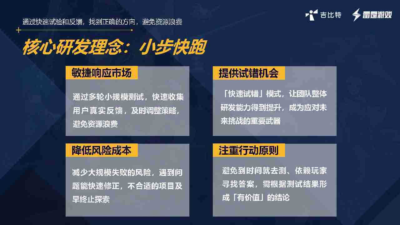 小步快跑不是找答案,,,,而是验证答案。。我们之前有项目是这样的,,,,有些制作人会有几个方向觉得都可以做,,,,但是不确定做哪一个,,会选择几个都做,,,做完拿到市场跑,,,跑出哪一个更好,,,基于这个再做后续的研发和拓展。。。但这种情况最容易出现一个问题,,可能被玩家裹胁,,,玩家说这个点不错、、、、那个点不错,,到底听还是不听,,,,不听感觉是无视玩家的反馈,,,,听的话,,可能自己没想清楚导致研发思路发生偏颇。。所以针对这一点后面自己复盘整理,,,发现制作人自己心里要有数,,,要做自己觉得好玩的,,,,而且明确知道这个东西是你想做的,,然后拿到市场验证这个答案是不是对的,,而不是拿一堆答案找哪一个答案更好。。。。