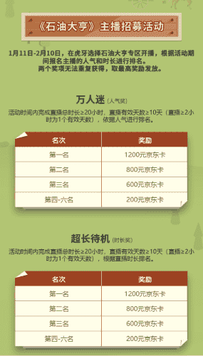 除了“油王”争霸赛,,精英主播招募活动亦同步开启!!!!赛事分时长奖和人气奖,,,奖励同样丰厚!!